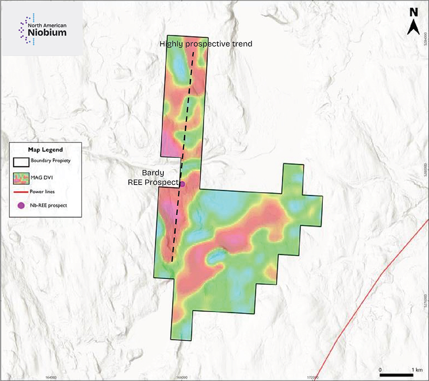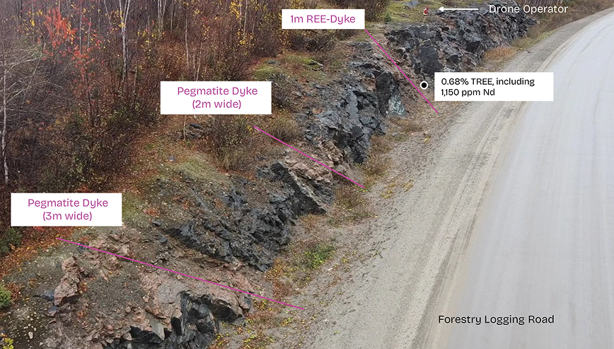The Bardy Property hosts multiple north–south–oriented granitic pegmatite dykes ranging from 40 centimetres to 4 metres in width, situated along a 7-kilometre prospective trend. These pegmatites are exposed along forestry roads, providing excellent accessibility for mapping, sampling, and drill-site planning. The geological setting reflects a structurally controlled environment conducive to rare earth enrichment, with distinct REE-bearing zones already identified at surface.